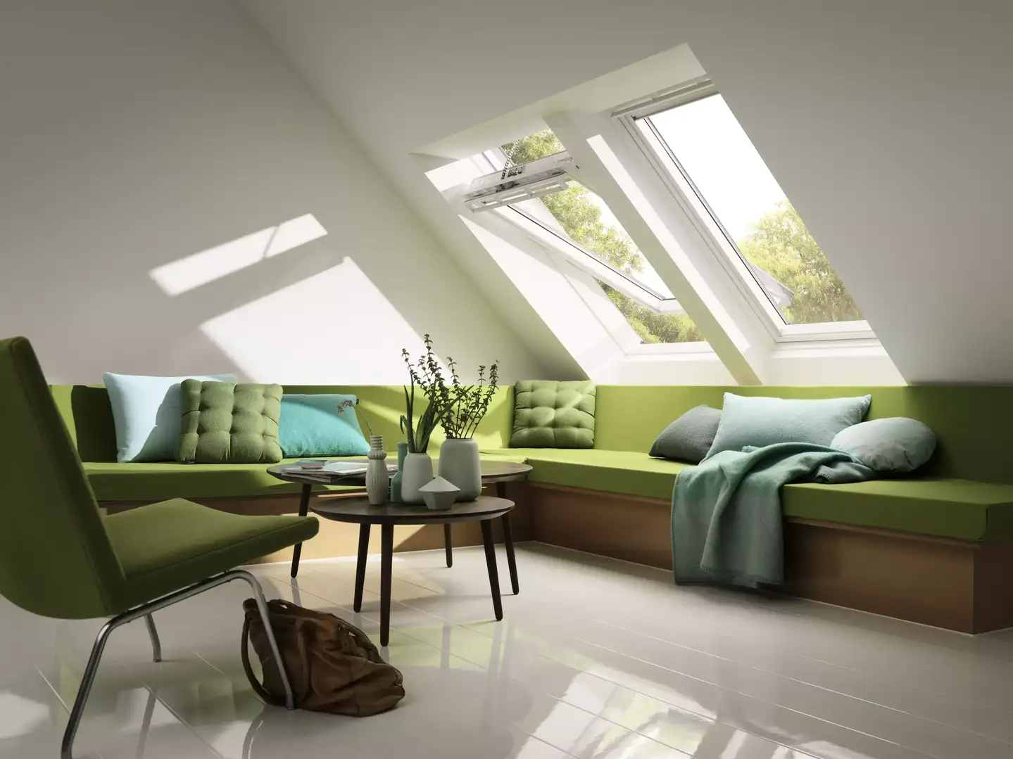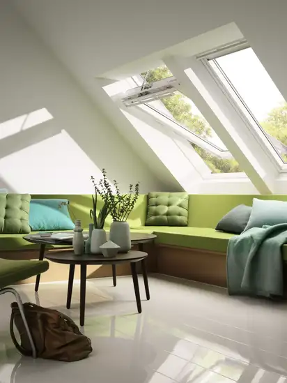 Im Rahmen einer Sanierung schaffen nachträglich eingebaute Bungalow-Dachfenster eine helle Wohnatmosphäre und tragen zu einem gesunden Raumklima bei.
