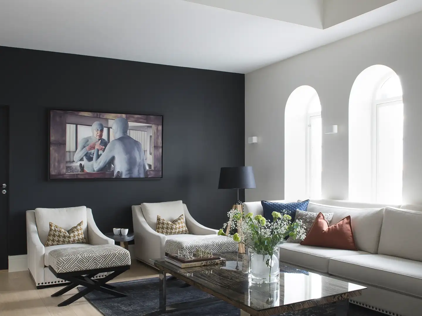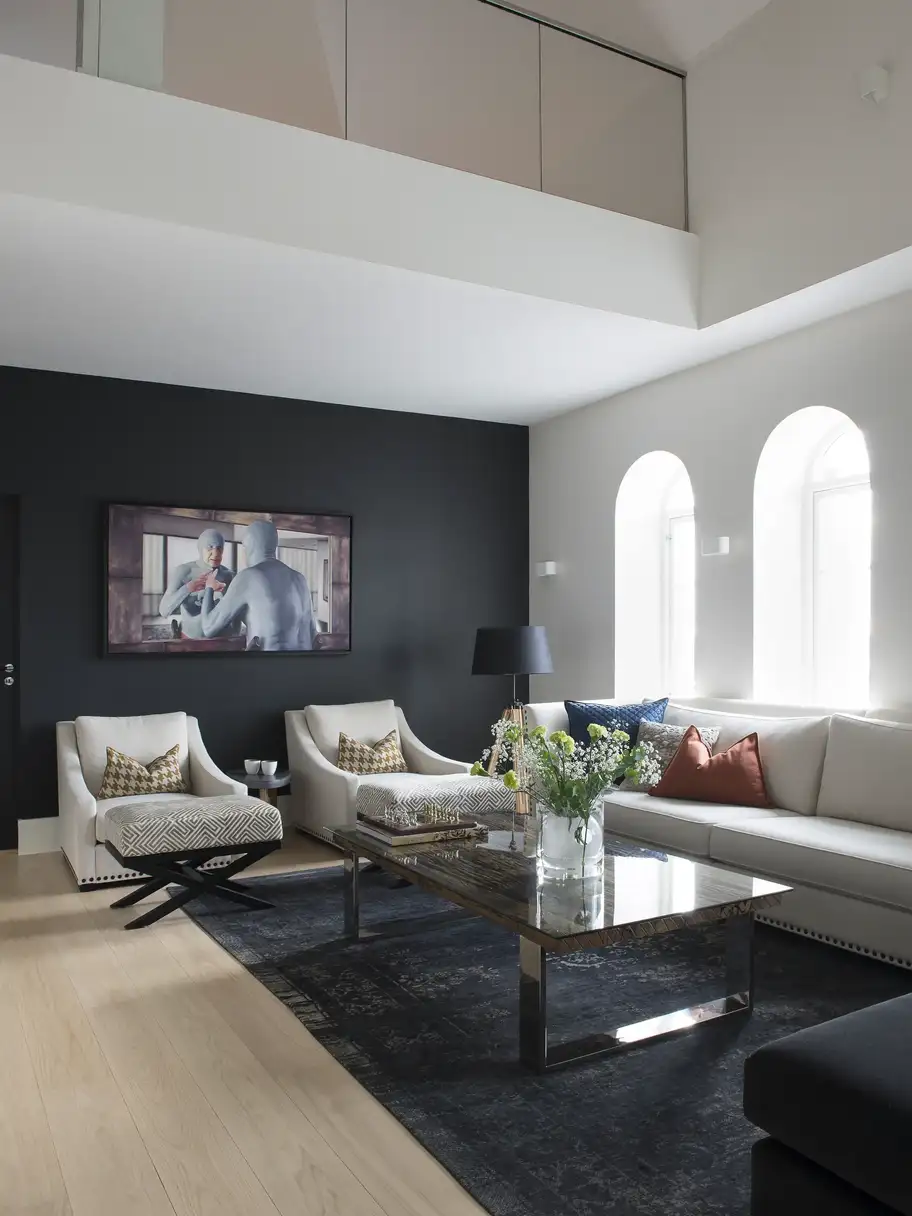 Tagsüber unterstützt natürliches Licht durch Dachfenster die edlen Materialien zusätzlich – ein Marmortisch mit Messingrahmen reflektiert das einfallende Tageslicht und lässt Oberflächen funkeln. So verbinden Sie die klassische Art-Déco-Lichtinszenierung mit den Vorteilen moderner Wohnräume und schaffen ein Design, das zu jeder Tageszeit beeindruckt.