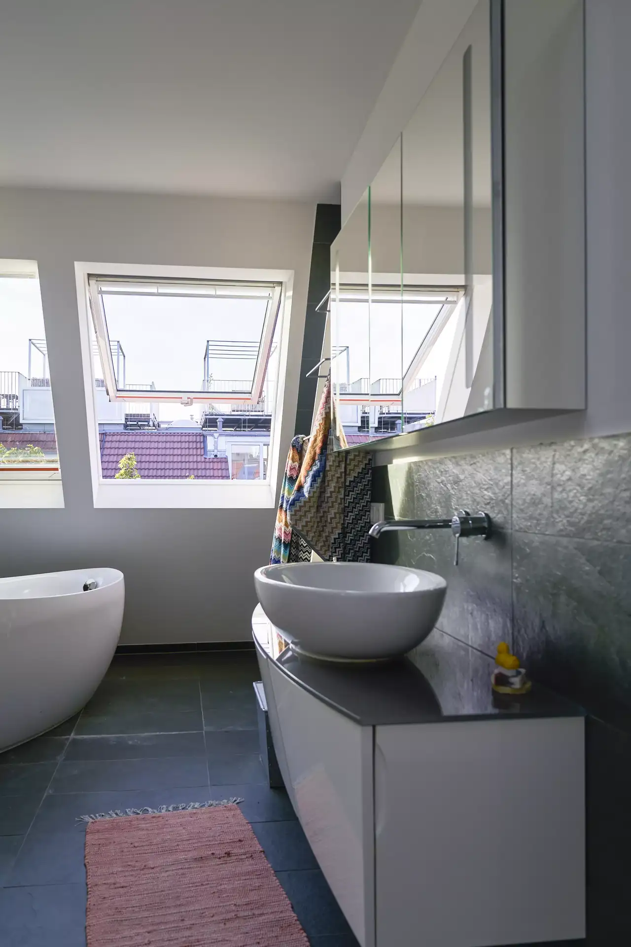 Zugleich beugen Sie einem Schimmelbefall vor. Außerdem praktisch: Wenn Sie Badezimmer-Fenster mit einer Gaube kombinieren oder sogar einen Dachbalkon einbauen, schenken Sie dem Zimmer zusätzliche Größe.