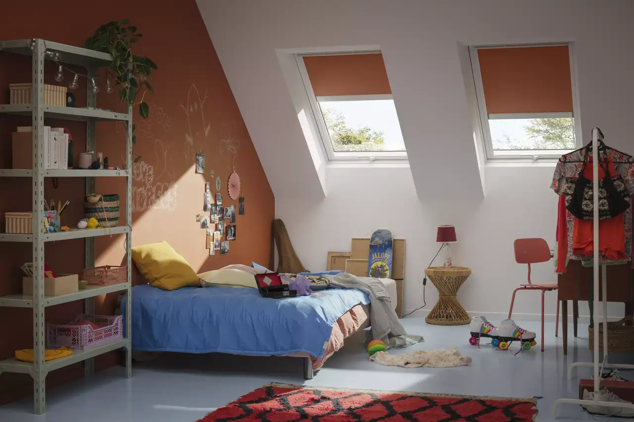 Farbliche Rollläden bieten nicht nur wertvollen Sonnen- und Hitzeschutz, sondern setzen auch optische Akzente in Ihren Räumen unter dem Dach.