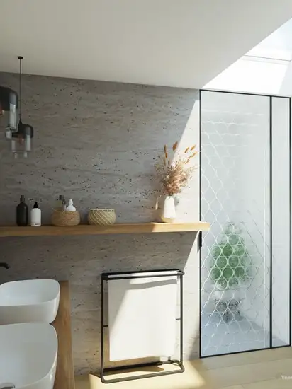 - Holz (Eiche, Bambus, Zeder) verleiht Waschtischen, Regalen oder Badewannenverkleidungen eine warme Haptik.