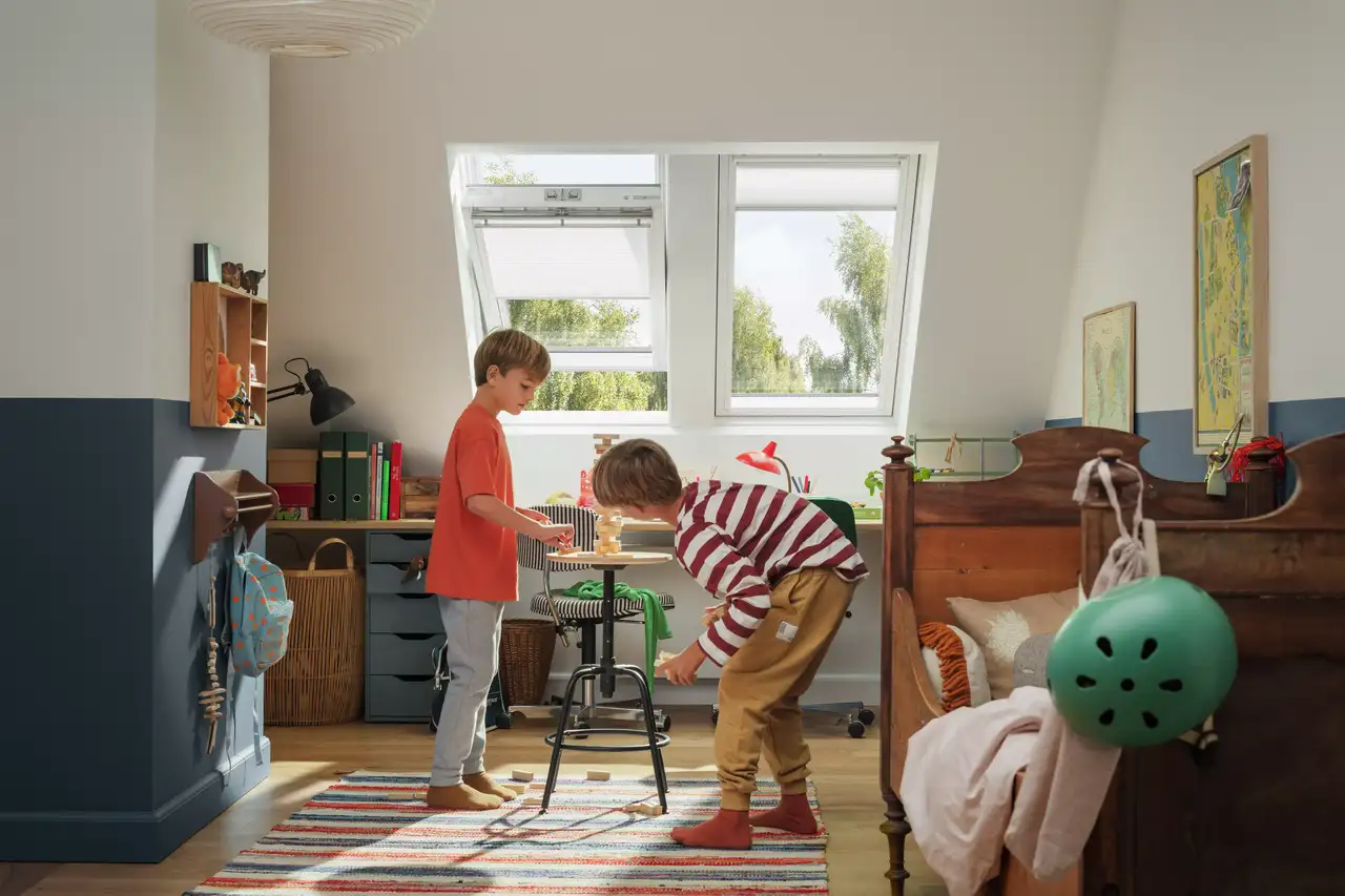 Bei zu trockener Raumluft kommen klassischerweise Luftbefeuchter oder kleine Schälchen mit Wasser zum Einsatz. Ist die Feuchtigkeit dagegen zu hoch, hilft richtiges Lüften, genaugenommen häufiges Stoßlüften. Gerade in Kinderzimmern im Dachgeschoss ist ein elektrisches Dachfenster eine ideale Lösung. Es lässt sich auf Knopfdruck automatisch öffnen und Sie können auch bei hohen Zimmerdecken ganz einfach lüften. Bei regulären Dachfenstern empfehlen wir bei kleineren Kindern Sicherheits-Zubehör, wie zum Beispiel die Öffnungsbegrenzer für Dachfenster.
