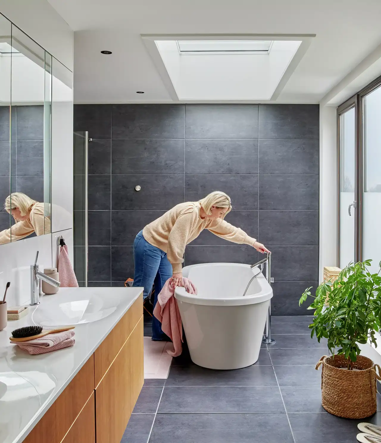 Praktische Oberlichter im Bad helfen durch die natürliche Tageslicht-Versorgung auch beim Strom sparen.