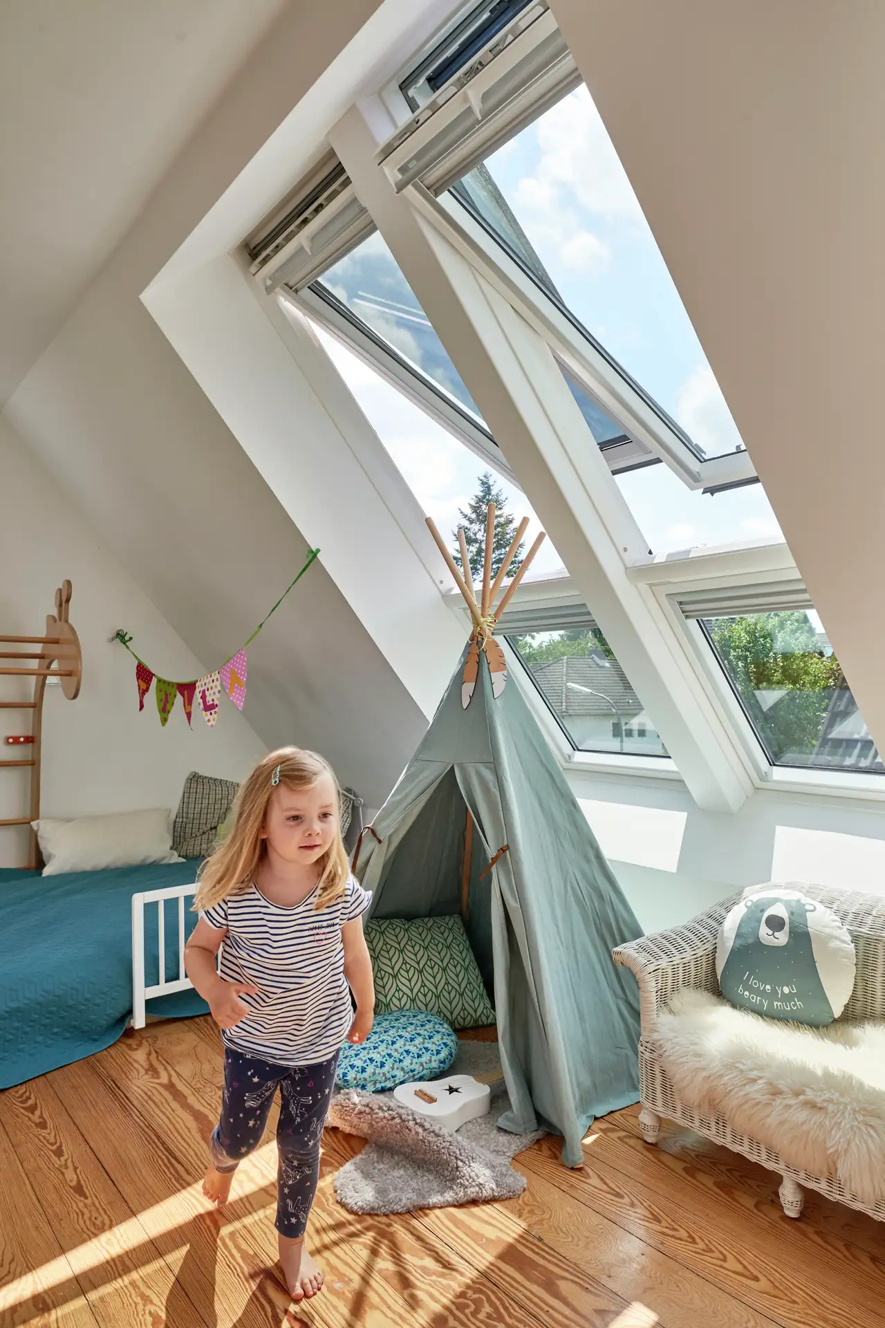 Bei der Dachsanierung wurde die vorhandene Gaube zurück- und stattdessen zahlreiche VELUX Dachfenster eingebaut. Die beiden Kinderzimmer im Dachgeschoss profitieren ungemein vom vielen Tageslicht durch die Velux Lichtbänder und Fenster: Obwohl sie nur je ca. 10 m² groß sind, wirken sie großzügig und lichtdurchflutet. „Unsere große Tochter Karla liebt es, unter dem Fenster zu sitzen: zum Bücher anschauen, Rausgucken, Vorlesen – ihr absoluter Lieblingsplatz!“, verrät Oliver Herr.