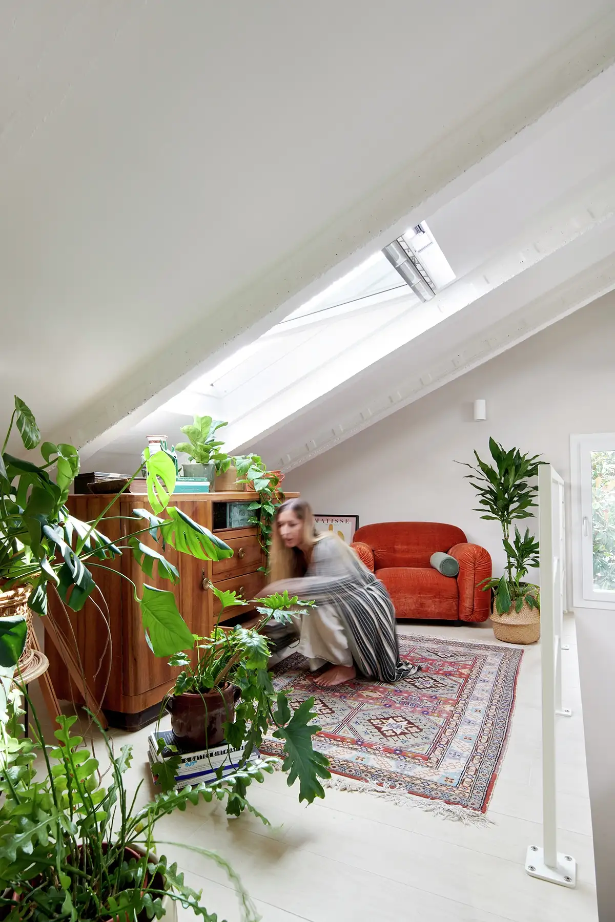 Holzkommode umringt von Zimmerpflanzen unter Dachfenster | VELUX Magazin